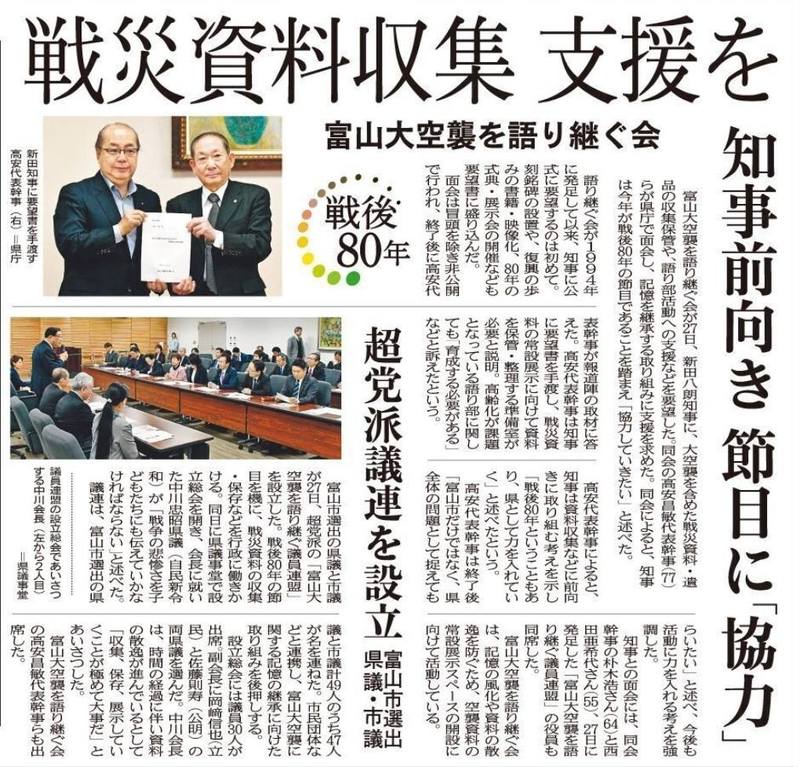1月27日は富山大空襲を語り継ぐ議員連盟の設立総会に参加。私は超党派議連の役員のうち事務局長を務めさせていただくことになりました。戦後80周年を節目に、企画展示や語り部の伝承、資料収集への支援など、語り継ぐ会の活動をできる限りサポートしてまいります。