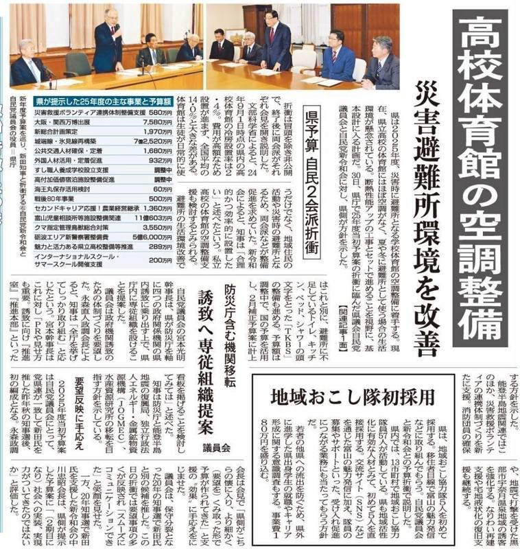 1月30日は令和7年度当初予算の知事折衝に同席。昨年秋から現地視察や職能団体のヒアリング内容を12の重点要望にとりまとめた項目をベースに、予算折衝を重ねてきました。その集大成の場となります。県採用の地域おこし協力隊や高校体育館空調等、富山県として初めて取組む事業も多く盛り込まれました。