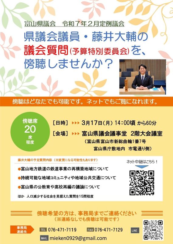 ホーム>政党・政治家>藤井 だいすけ (フジイ ダイスケ)>本日3月17日14時からの予算特別委員会で質問に立ちます。