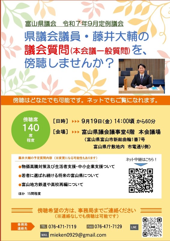 9月19日(金)の県議会一般質問で藤井大輔が4番目に登壇します。14時頃のスタートです。