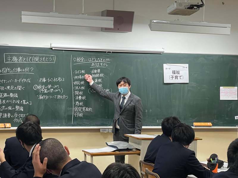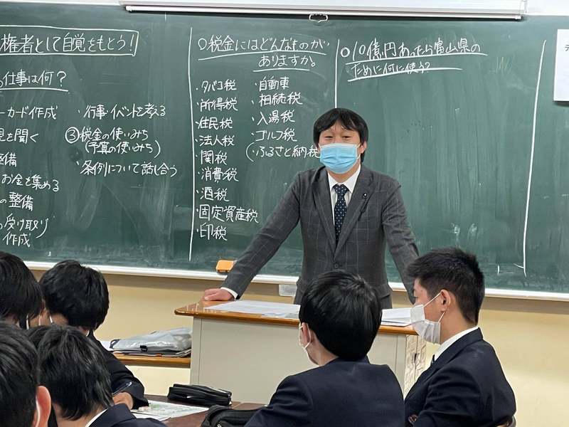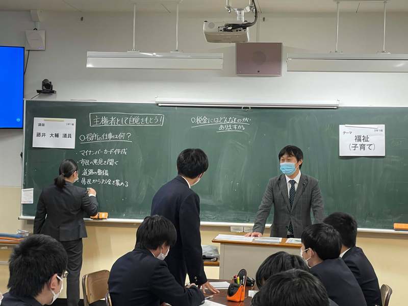 全国的にも、県議会として複数の議員が高校に出向いて講義を行うといった事例はほとんどなく、カリキュラムもイチから作りました。7月から複数回、議会と学校と協議の場を重ねて、1年生から3年生まで全部で11クラスを、2コマ(5時限目と6時限目)を使って、全クラス同時に出前講座を行うスタイルに。議員が先生役になって進行し、担任がそのフォローをするカタチとし、学生と議員が直接対話できるようにしました。先生役の議員には、各クラスで内容がぶれることのないよう、事前のオリエンテーションをしっかり受けてもらいました。