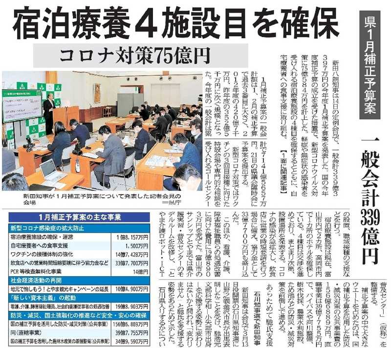 国の令和3年度補正予算・約36兆円の決定を受け、富山県でも約340億円の補正予算案が示されました。内訳は、新型コロナ対策で75億円、防災減災等の公共事業等で約240億円、観光キャンペーンの延長等で約10億円となっています。1月21日に臨時議会が開かれ、即日採決される予定です。以下、簡単にその内容をお伝えします。