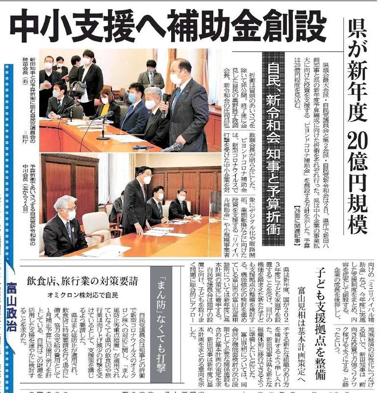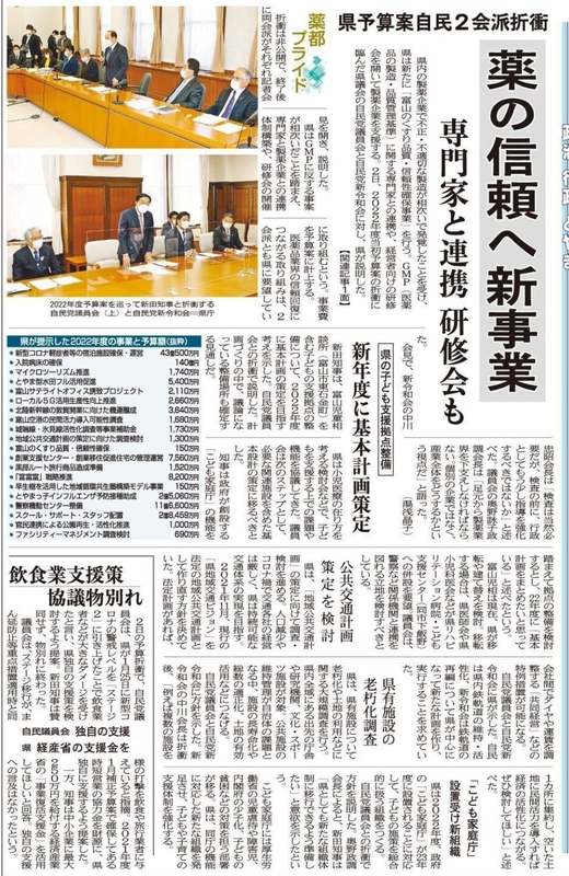富山県議会の2月定例会(2月25日~3月24日)は、令和4年度予算を審議する大切な場ですが、その前哨戦となるのが、会派ごとに要望を県庁側と協議する「党折衝」です。私は、最大会派である自由民主党富山県議会議員会の政調会副会長として、協議に参加いたしました。