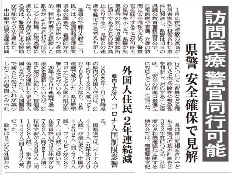 2月18日の県議会の教育警務委員会で、ふじみ野市の医師殺害事件を受け、在宅看護介護従事者の安全確保の重要性を訴えました。