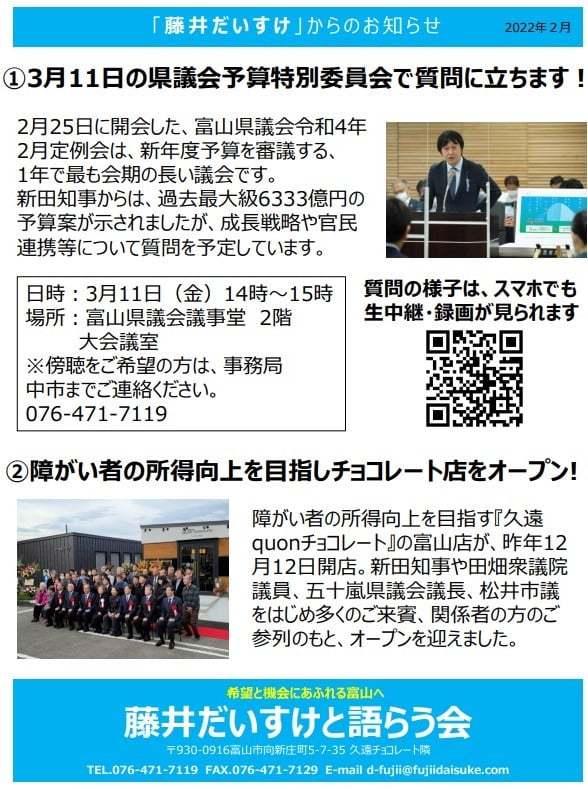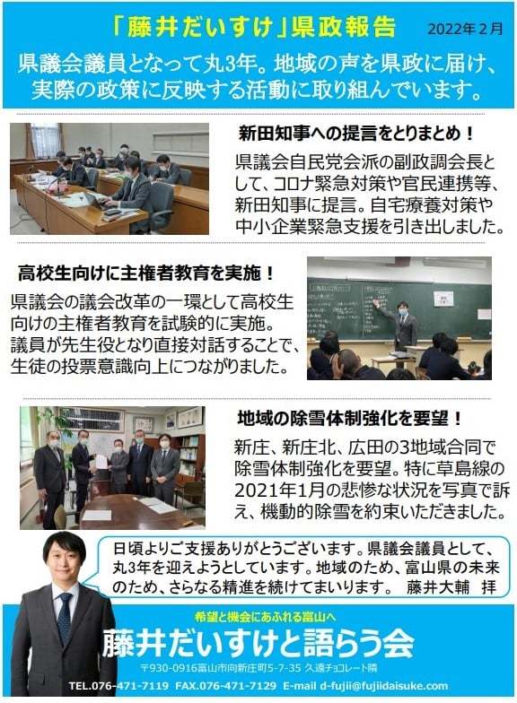 総会向けに、簡易的ではありますが、新しい県政通信を作成しております。よろしければ写真添付しておきますので、ご覧ください。
