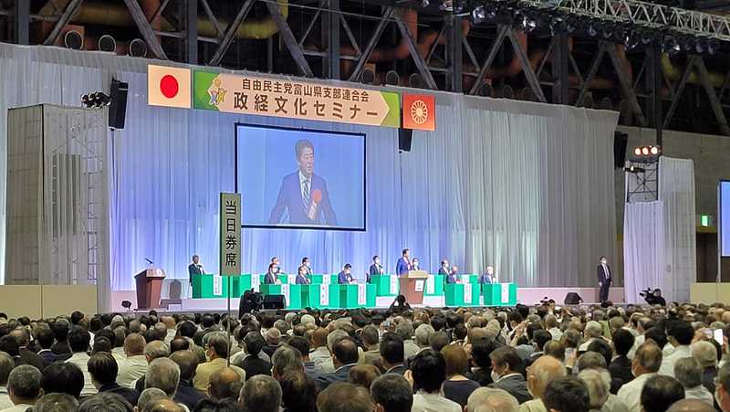 本日5月29日は、自民党富山県連主催の政経文化セミナーです。富山市のテクノホールに約2,000名の方々にお越しいただき、4年ぶりに盛大に開催されております。写真は、来賓である元総理大臣の安倍晋三議員です。 残念ながら、特別講師の竹田恒泰さんがコロナで来県できず、オンラインとなりました。