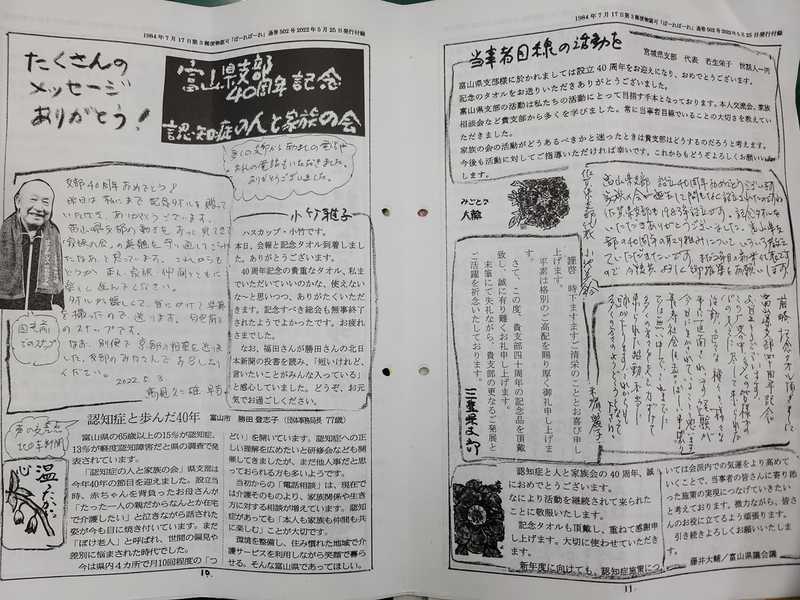 認知症の人と家族の会、富山県支部さんが40周年を迎えられ、そのお祝いのメッセージが会報誌「ぽ~れぽ~れ」5月号に掲載されております。