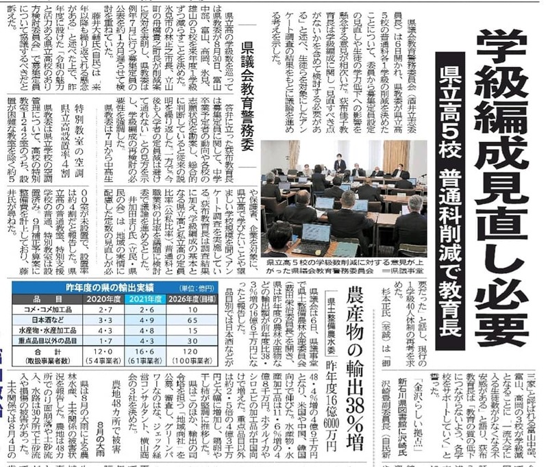 特に県立高校の学級数については、今朝の富山新聞さんにも詳しく取り上げていただきました。