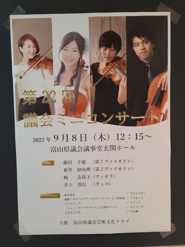 本日9月8日から9月定例会が開会し、225億円の補正予算を審議します。今日は知事提案理由説明の後に、議会芸術文化クラブ主催のミニコンサートが開催され、藤田千穂さん、新井紗央理さん(共にバイオリン)、嶋志保子さん(ヴィオラ)、井上貴信さん(チェロ)の四重奏が議事堂に響き渡りました。