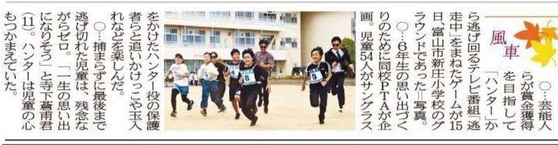 10月15日には、私の母校、富山市新庄小学校でPTAの方々が企画した「逃走中」鬼ごっこが行われました。