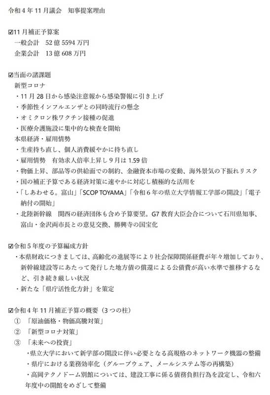 今週月曜日の11月28日に富山県議会11月定例会が開会いたしました。一般会計で52.6億円の予算を審議しております。新田知事から議会に上程された提案理由について、藤井だいすけが編集してまとめた要旨をPDF化いたしました。ぜひ下記リンクをクリックしてご覧ください!