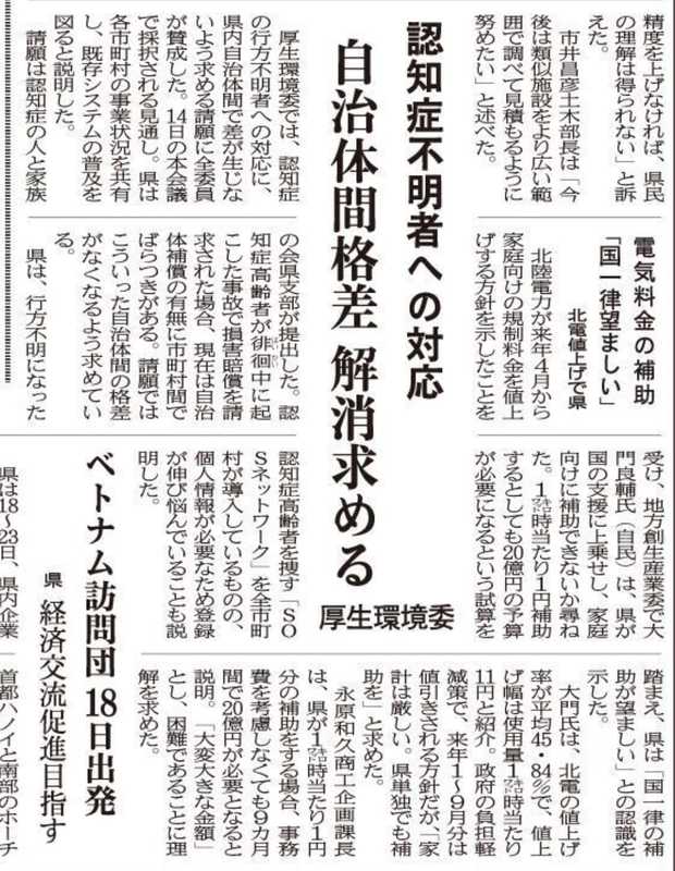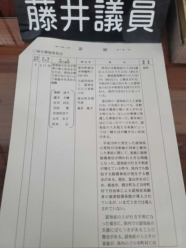 県議会の11月定例会が閉会しました。その中で、認知症の行方不明者の命と安全を守るための支援を全県で差がないよう求める請願が、全会派一致で採択されました。 認知症の人と家族の会からの要望を元に奔走した結果です。これを契機に認知症対策がさらに広がるよう、引き続き取り組んでまいります。
