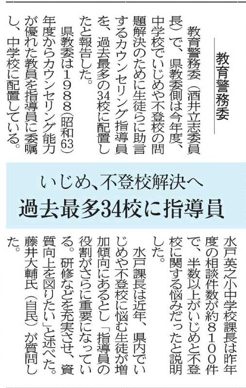 ホーム>政党・政治家>藤井 だいすけ (フジイ ダイスケ)>富山県教育の独自の施策に、公立中学校のカウンセリング指導員(教育相談を専任とした教員)の配置が...