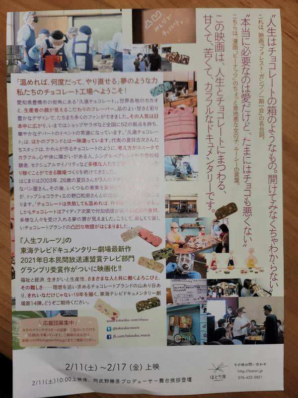 久遠チョコレートの創始者、夏目浩次さんの活動を19年間追い続けたドキュメンタリー映画『チョコレートな人々』が、富山のほとり座で上映されます!