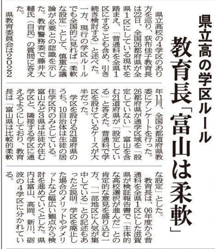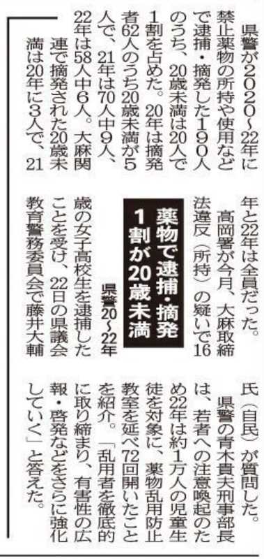 2月22日は富山県議会の教育警務委員会でした。私からは13日の総合教育会議の開催を受けて、全県1学区の議論と不登校特例校について県教委の考えをお聞きし、新年度に議論を加速してほしい旨を要望しました。また県警には若者の大麻事案について。この3年で10代の検挙が20人もあり、対策が急務です。