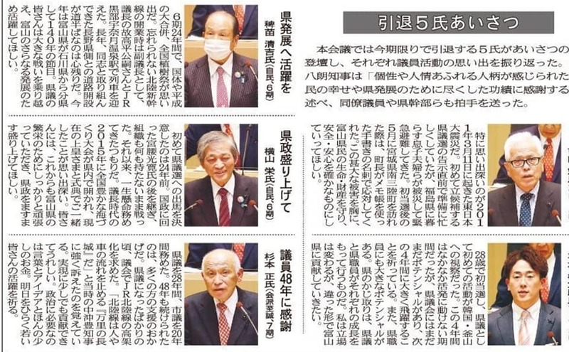 3月15日に富山県議会2月定例会が閉会し、約6400億円の予算が可決。また今議会をもって勇退される先輩議員5人の方々から挨拶がありました。