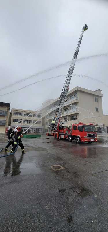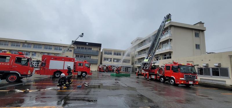富山消防署•富山方面団•大山消防署•大山方面団が共同して実施された訓練は、真剣そのもの。40メートルのはしご車を使った屋上からの救助は迫力ありました。