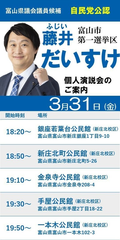 ホーム>政党・政治家>藤井 だいすけ (フジイ ダイスケ)>3月31日の街頭演説会と個人演説会の予定です。
