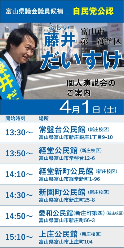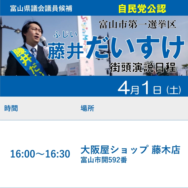 4月1日は日中に個人演説会、街頭演説会を予定しております。