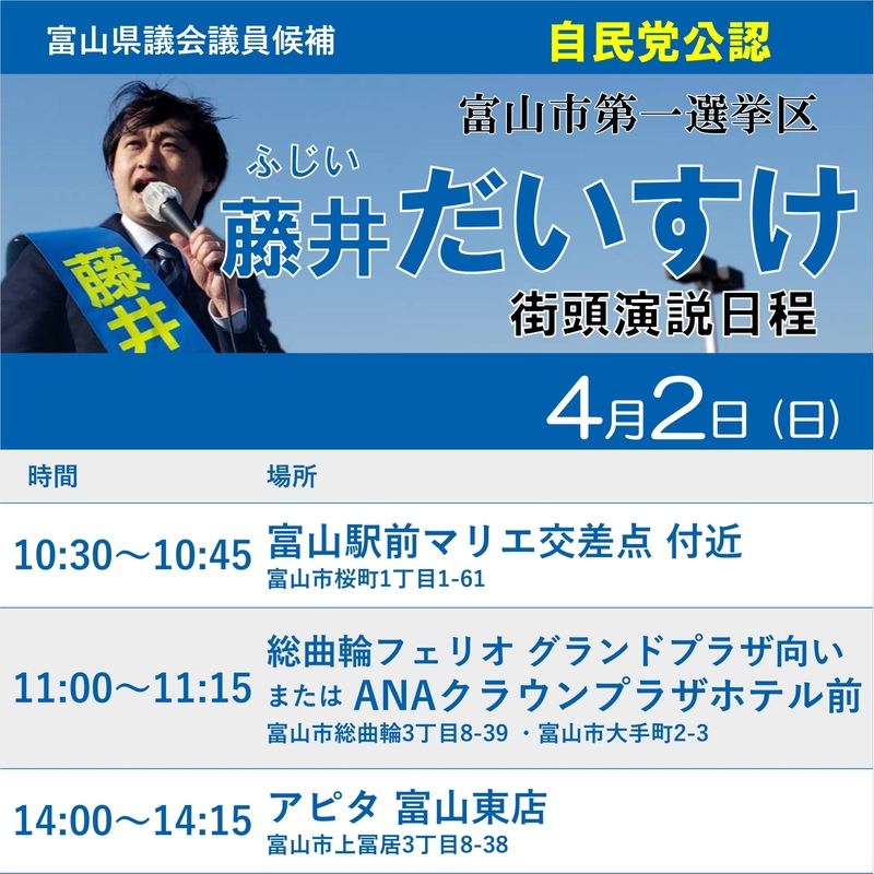 ホーム>政党・政治家>藤井 だいすけ (フジイ ダイスケ)>おはようございます!4月2日日曜日も、春らしいお天気。