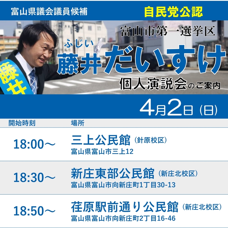 本日の街頭演説会と個人演説会の予定です。ぜひお越しください!