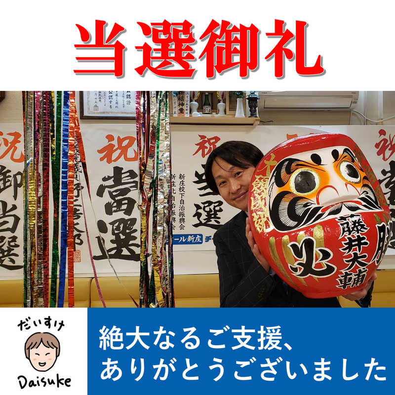 「藤井 だいすけ」をご支援いただける方は、是非個人献金をお願い申し上げます。※選挙ドットコム会員登録(無料)が必要です。