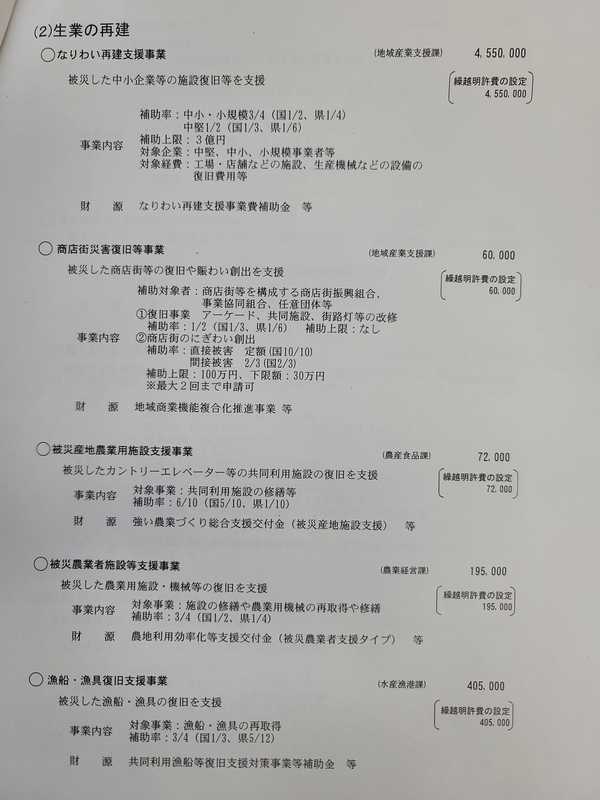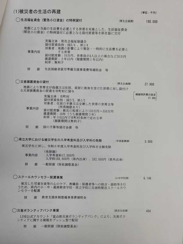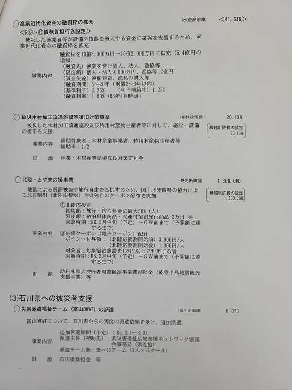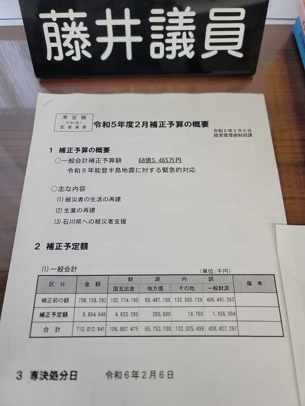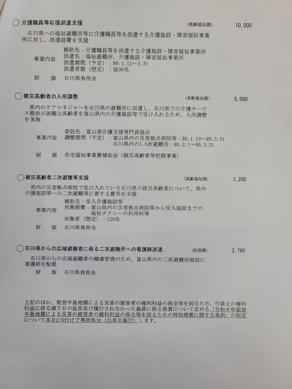 富山県では2月6日に補正予算68.5億円が専決処分されました。1月26日に閣議決定された国の被災者支援パッケージを、速やかに県内被災者や中小企業へ届けるための専決処分です。