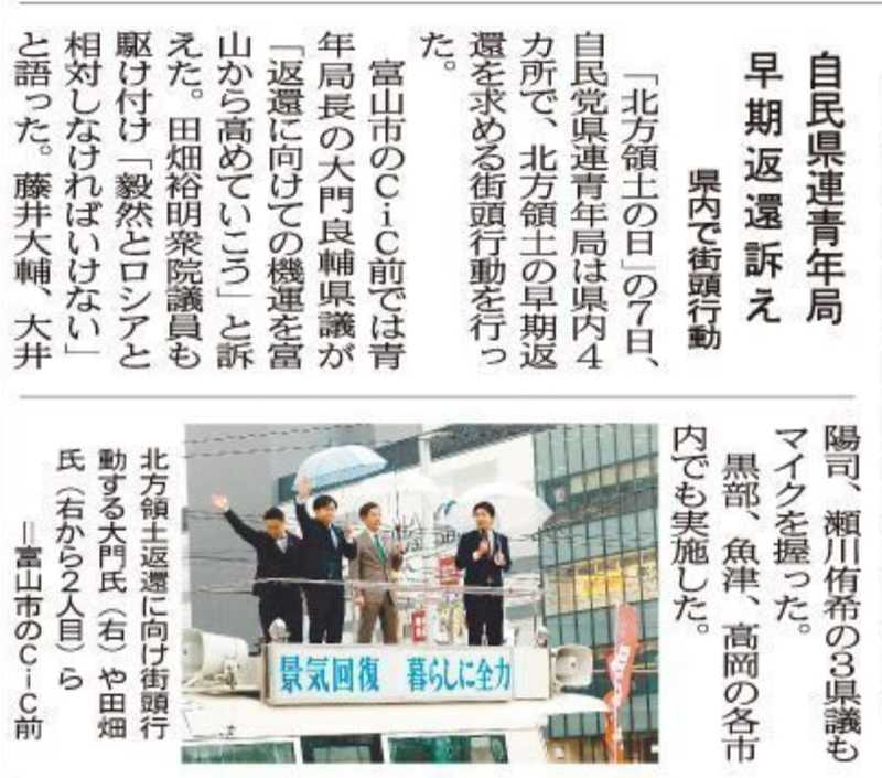 北方領土の日の2月7日は、早期返還を求める街頭活動に参加。 富山駅前での街宣では私もマイクを握り、富山県が4島からの帰還者が北海道に次いで多いこと、その多くが富山の食文化に欠かせない昆布漁をされていたこと、日ロ関係が悪化する中で国民の機運をこの富山から醸成しましょう、と訴えました。