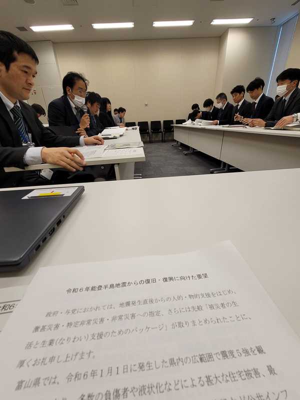 2月19日は震災復興支援の要望活動で丸一日東京に。 渡海政調会長から「お金の問題で被災自治体が躊躇しないよう」との力強いご発言。総務省の新田財政課長からも「復興基金なくても特別交付税で支援する」との言葉が。 多くの中央省庁の方々が富山に想いを寄せて下さっていること、実感いたしました。
