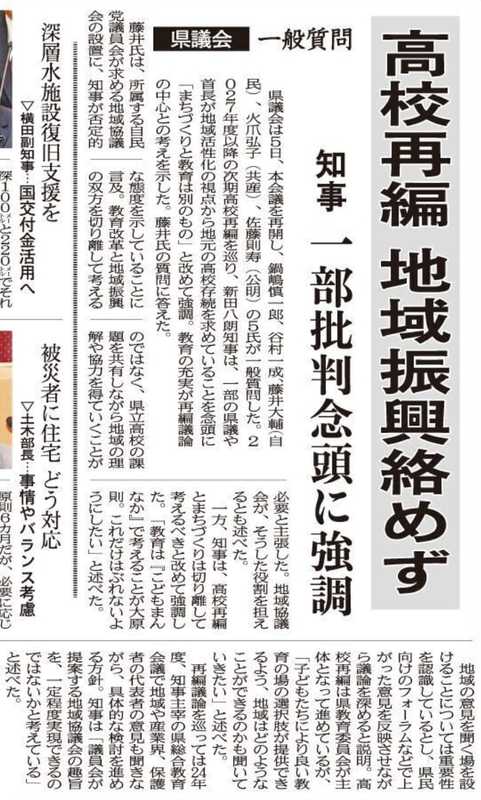 「高校と地域」を「仕事と家庭」に例えて、課題を共有し一緒に協議することの重要性を訴えたのですが、知事からは「仕事を家庭に持ち込んだことがないので、ピンと来ない」とのご答弁。