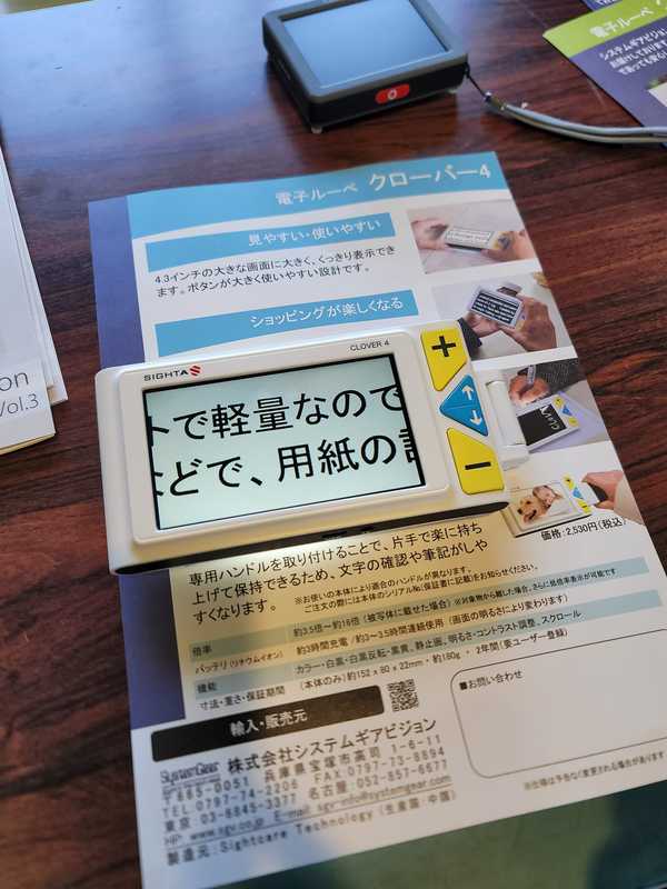 6月29日は視覚障がい者向けの相談会を見学。ロービジョン(Low Vision)、いわゆる見えにくさと、それに伴う生活上の不自由さを感じる方が対象で、最新テクノロジーの音声読み上げメガネやデジタルルーペ、盲導犬などいろんなサポートグッズを体験できました。