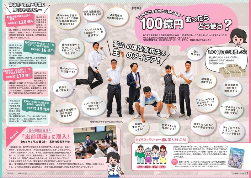 今回の特集は「現役高校生たちが考えた 100億円あったらどう使う?」です。県議会が行っている高校向け出前授業の中で、毎回高校生から「100億円あったら富山県をどう良くしたい?」のアイデアを募っており、今回の特集ではその意見が県政にどう反映されているかを見える化しました。