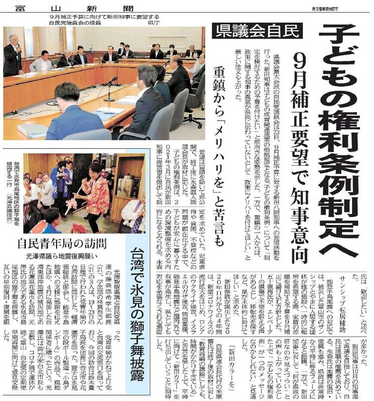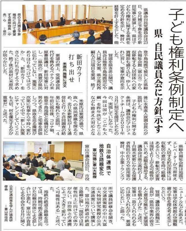 8月23日は新田知事への9月補正に向けた要望活動に同席。自民党県連の政調会が、6月から地域支部•友好団体•知事部局から丁寧にヒアリングした内容を、災害復旧から教育再編まで12テーマの要望書にとりまとめました。 来る9月議会は新田知事にとって1期め最後の議会。私は一般質問に登壇する予定です。しっかり頑張ります!