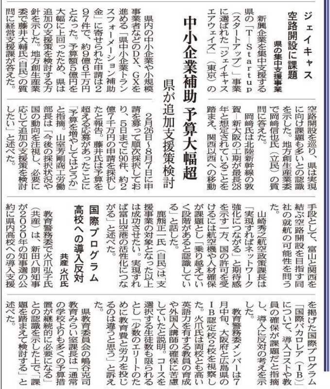 9月5日は地方創生産業委員会の質疑。私からは中小企業の経営刷新への後押しを強化すること、スタートアップ支援が市町村との奪い合いにならないこと、富山地方鉄道鉄道事業再編に向け県が関与すること、について6問質問いたしました。 6日からは9月議会が開会し、17日には私の一般質問も。頑張ります👊