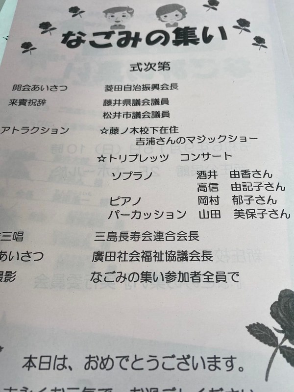 9月15日は新庄校区なごみの集い(75歳を祝う会)に参加。 今年75歳を迎えられる昭和24年生まれの出生数は290万人。昨年が72万人ですから、昨今の少子化の進行度合いがわかります。 会では、声楽ユニット•トリプレッツさんの素敵なミニライブ。メンバーには私の同級生がおられ、久々旧交を温めました!