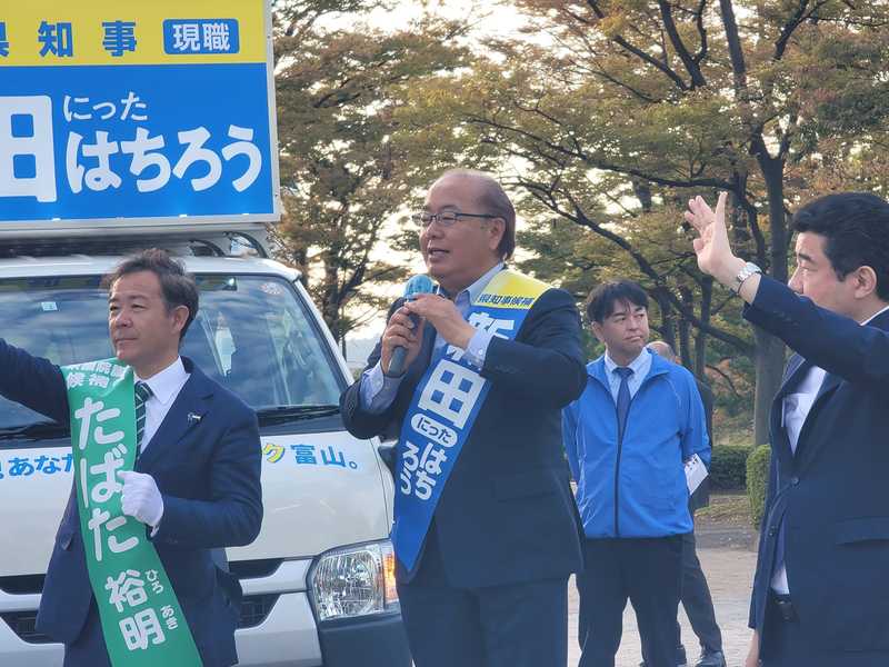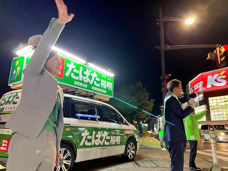 衆議院選挙の最終日の午後は街宣カーと街頭演説。新田県知事候補と田畑衆議院候補者のドッキング街宣にも参加し、最終最後まで支援を呼び掛けました。