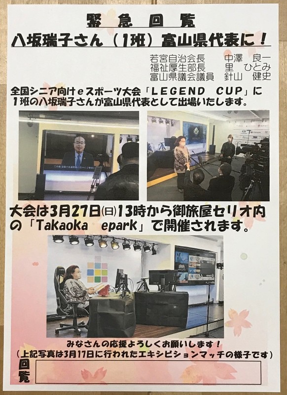 ホーム>政党・政治家>針山 たけし (ハリヤマ タケシ)>前回投稿の全国シニア向けeスポーツ大会のお知らせを修正! 3月27日㈰13時より伏木若宮公民館...