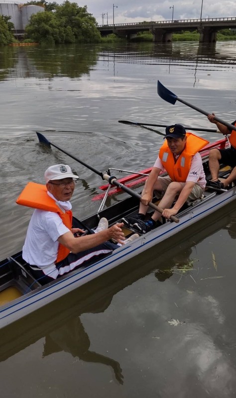 小矢部川でボートの練習。7月31日の伏木港まつりの協賛行事として開催されるボートレース大会、8月21日に行われる第35回つばたレガッタに富山県議会チームの一員として出場予定。