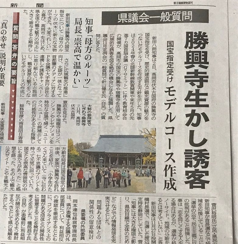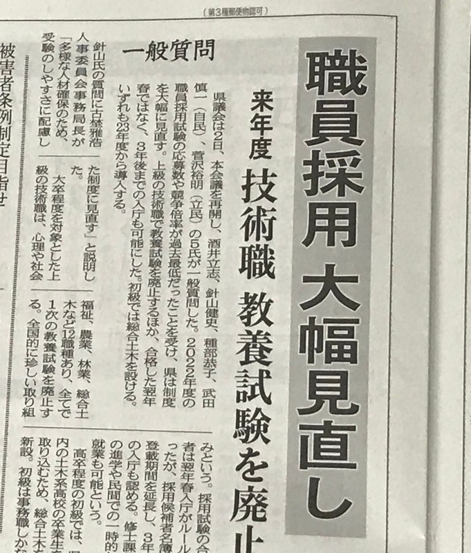 地元の勝興寺が国宝になったことを受け、どうしても県の取り組みを尋ねる質問をしたかったので順番など同僚議員に配慮いただきました。県職員採用試験が大幅に変更となることが答弁されて大きく記事にも取り上げていただきました。これまで以上にユニークな人材が職員として採用され、県の発展につながることを期待します。