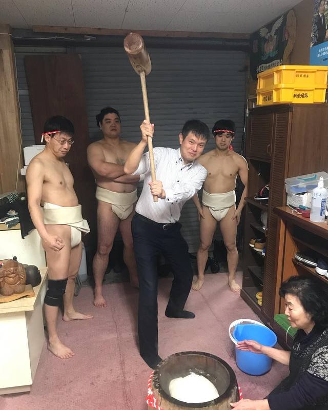 伏木相撲愛好会の毎年恒例「餅つき」。 我が子たちの進学祝と健やかな成長を祈念し、力士のみなさんに見守られてついてきました!