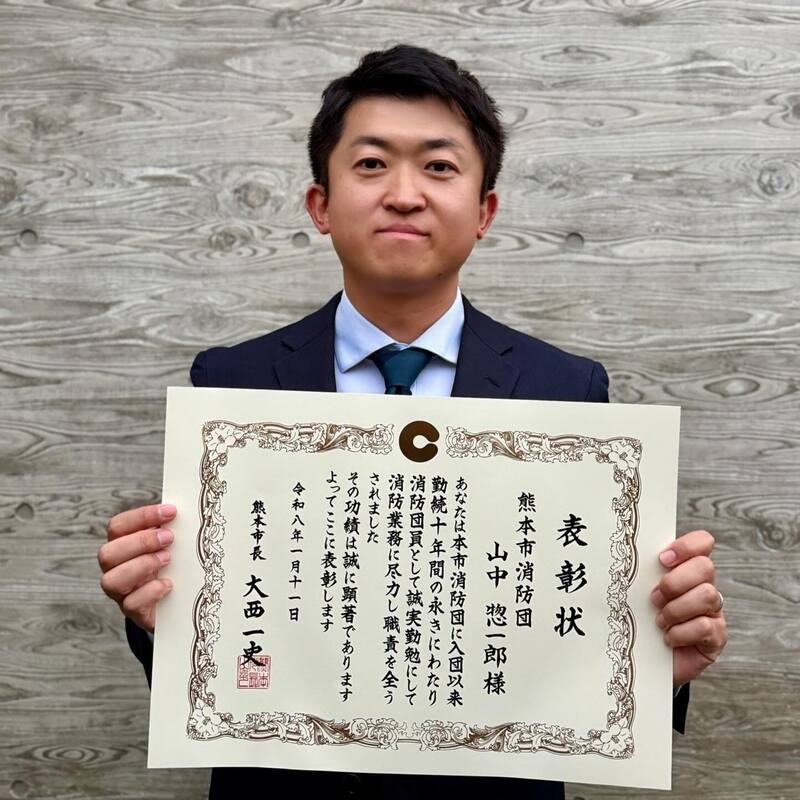 先日、消防団での活動に対し10年の表彰状をいただきました。