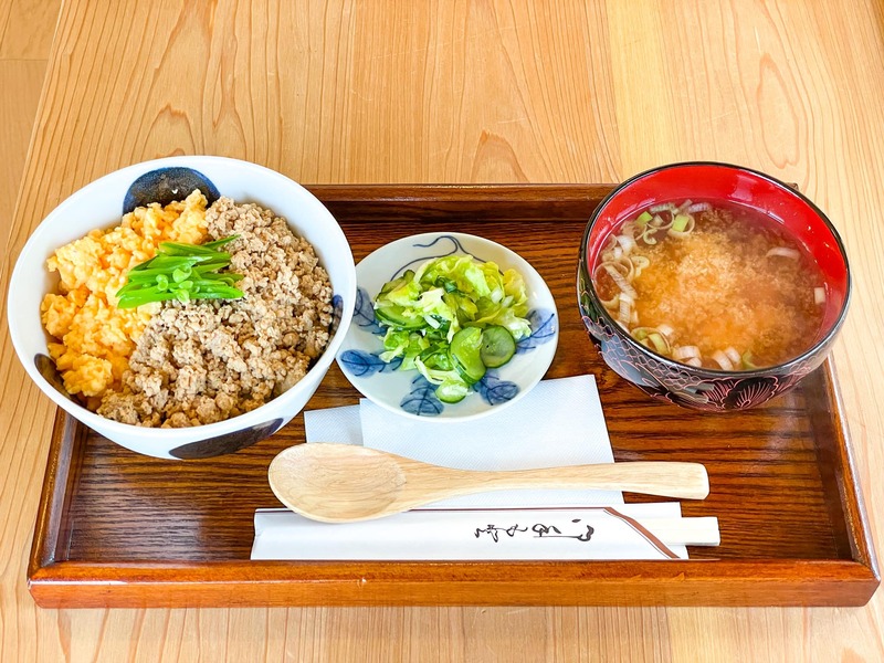 お昼は下新倉mugさんで「鶏そぼろ炒り卵小丼+豆腐味噌汁(お新香付き)」と食後にアイスコーヒーをいただきました。