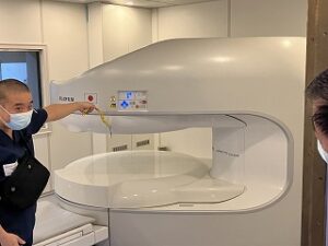 CTやMRIなどの設備があり、日本の国旗が記されていた。日本では見られないような形状のものもあった(ハンバーガー型のMRI)。体のサイズで入りきれない患者もいるとのこと。