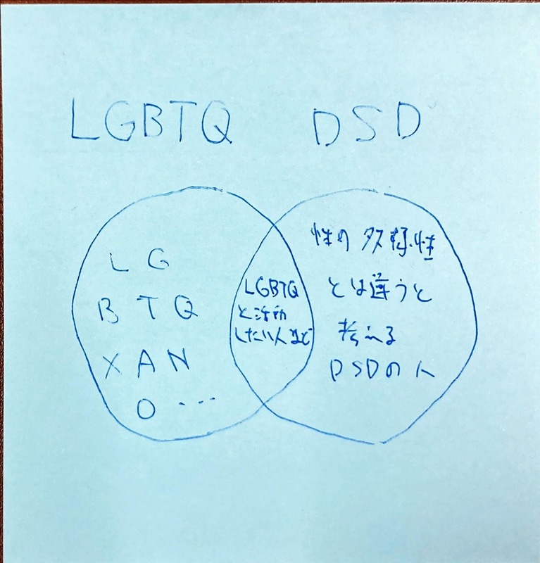 私としてはLGBTQ(様々な表現型を含め)という言葉が次第に広まっていく中で、DSDのことが取り残されることがあってはならないと思っています。また、無理にLGBTQに入れることも、逆に排除することもなく、その人の考えを尊重したいと思います。なので、LGBTQに関する講演をする際には必ずDSDについて触れるようにし「DSDをLGBTQに含めるかどうかはその人による」としています。