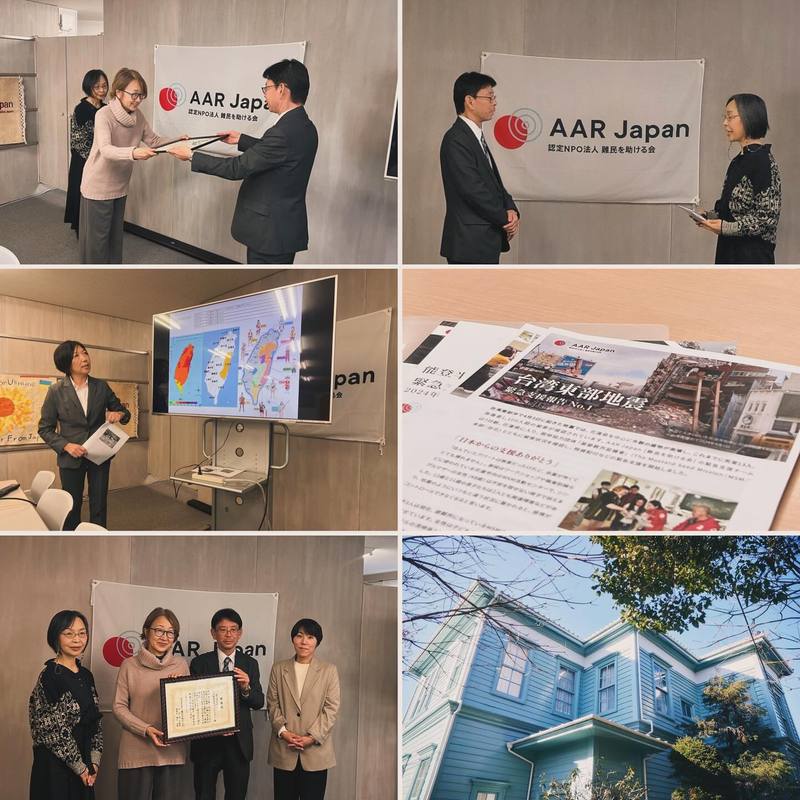 AAR様には、夏に尾崎邸で実施したオークションから、台湾東部地震や台風で被災された方々への支援金として、1千124万4,500円をお渡ししました。