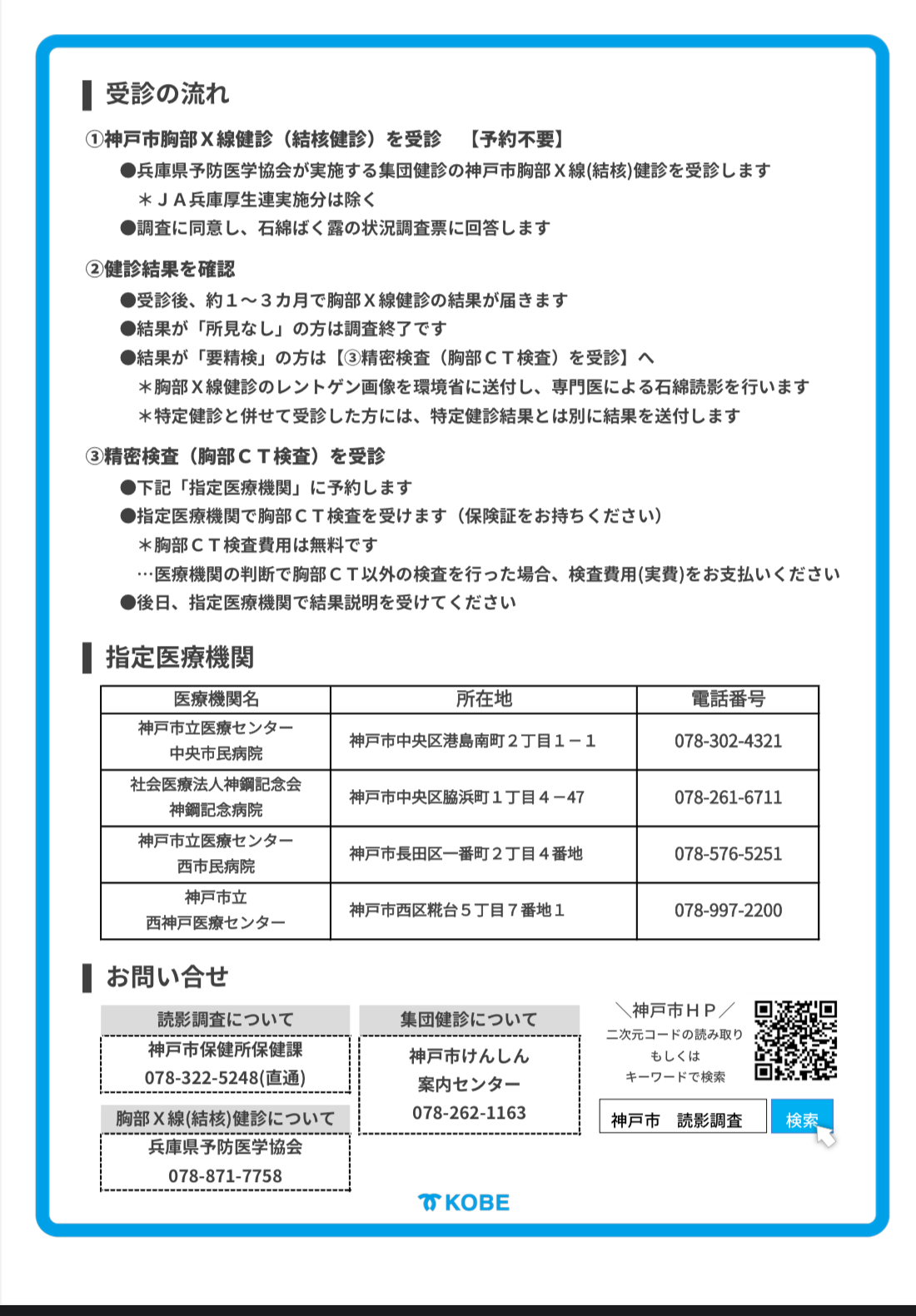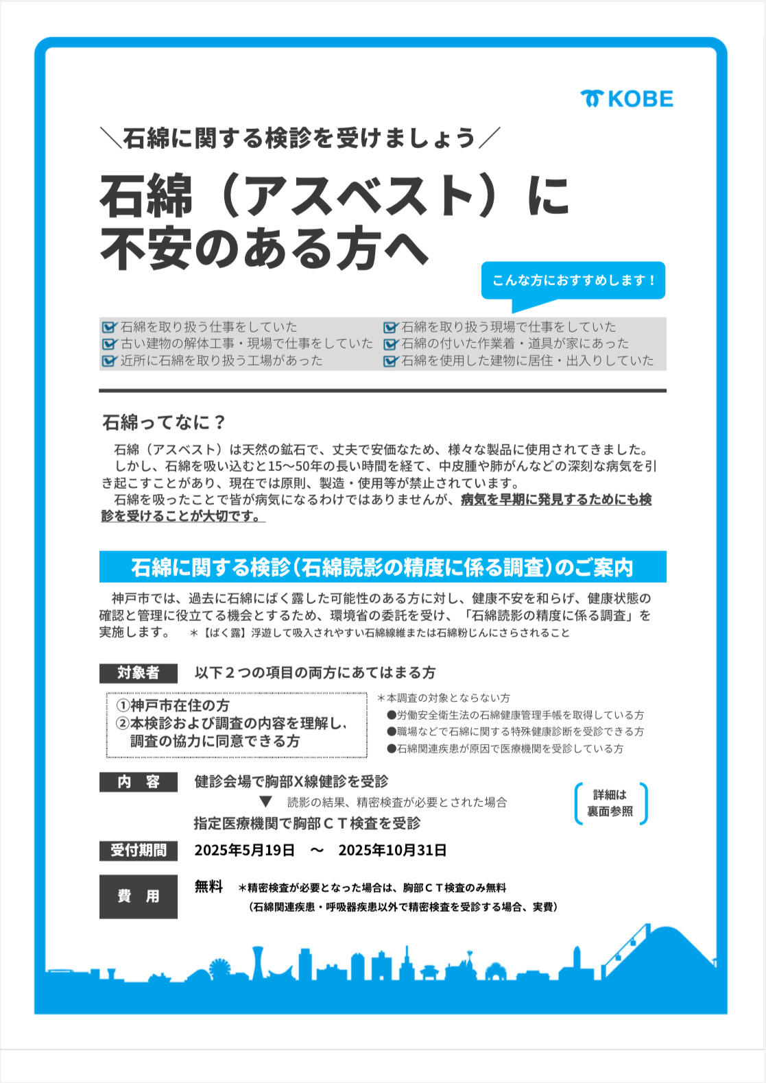 神戸市健康局発「2025年度(令和7年度)石綿読影の精度に係る調査」の最新情報を、共有させていただきます。