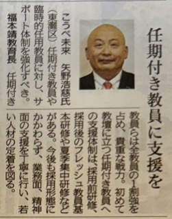 神戸市の小中学校では、主に育児休業や休職等の代替職員である任期付教員や臨時的任用教員は、全教員の約12.5%を占めており、貴重な戦力として学校現場を支えてくれている存在である。しかしながら、正規に採用された初任者については「初任者研修」や「初任研担当」がいるなどサポート体制が整えられている一方で、任期付教員や臨時的任用教員については同様の仕組みが十分に整っておらず、不安を抱えながら日々の業務を担わざるを得ない状況がある。