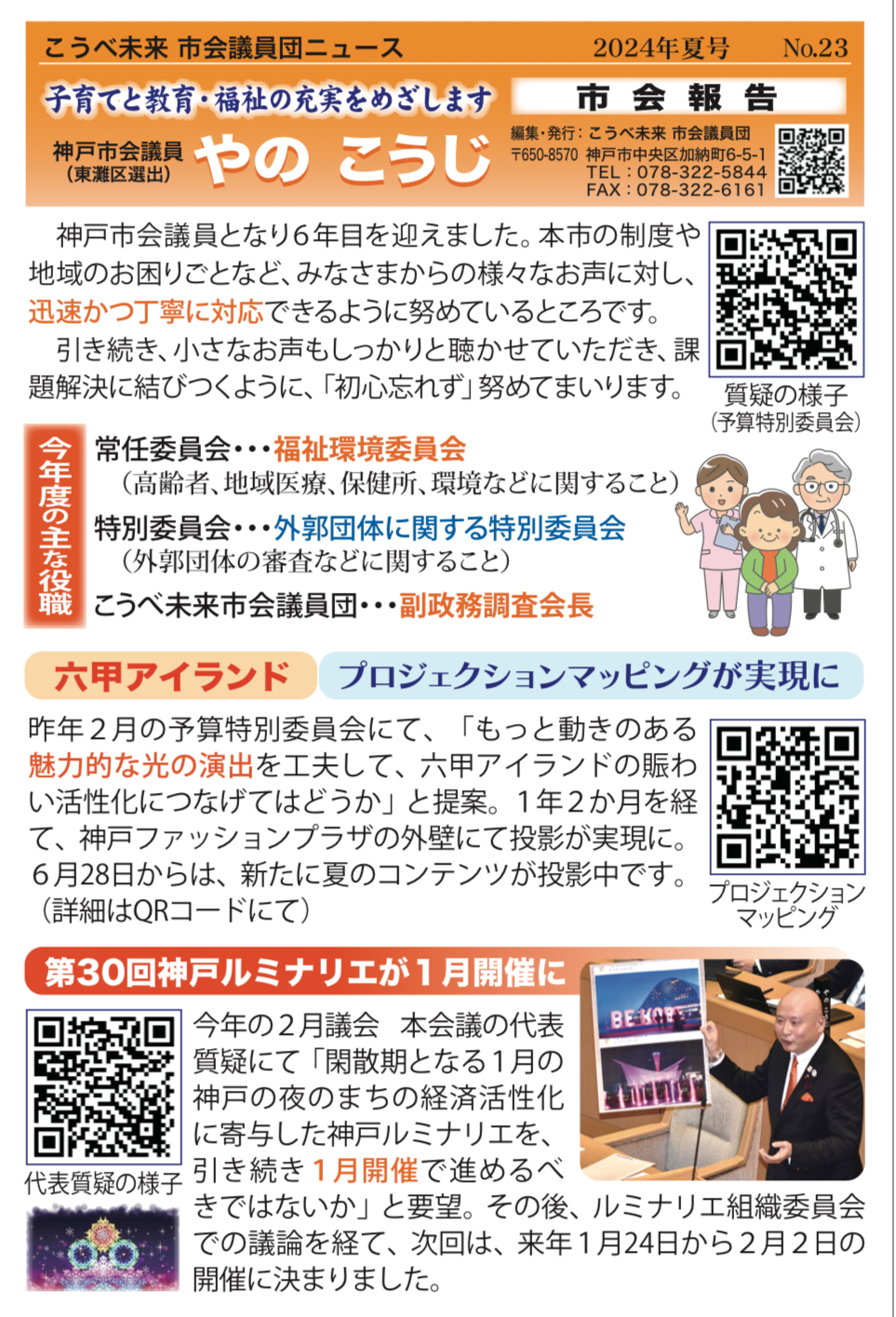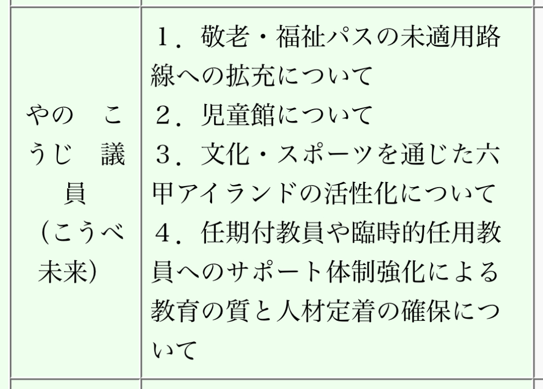 ホーム>政党・政治家>やの こうじ (ヤノ コウジ)>やのこうじ 神戸市会議員 敬老福祉パス、児童館、六甲アイランドの活性化、教育人材定着について質疑
