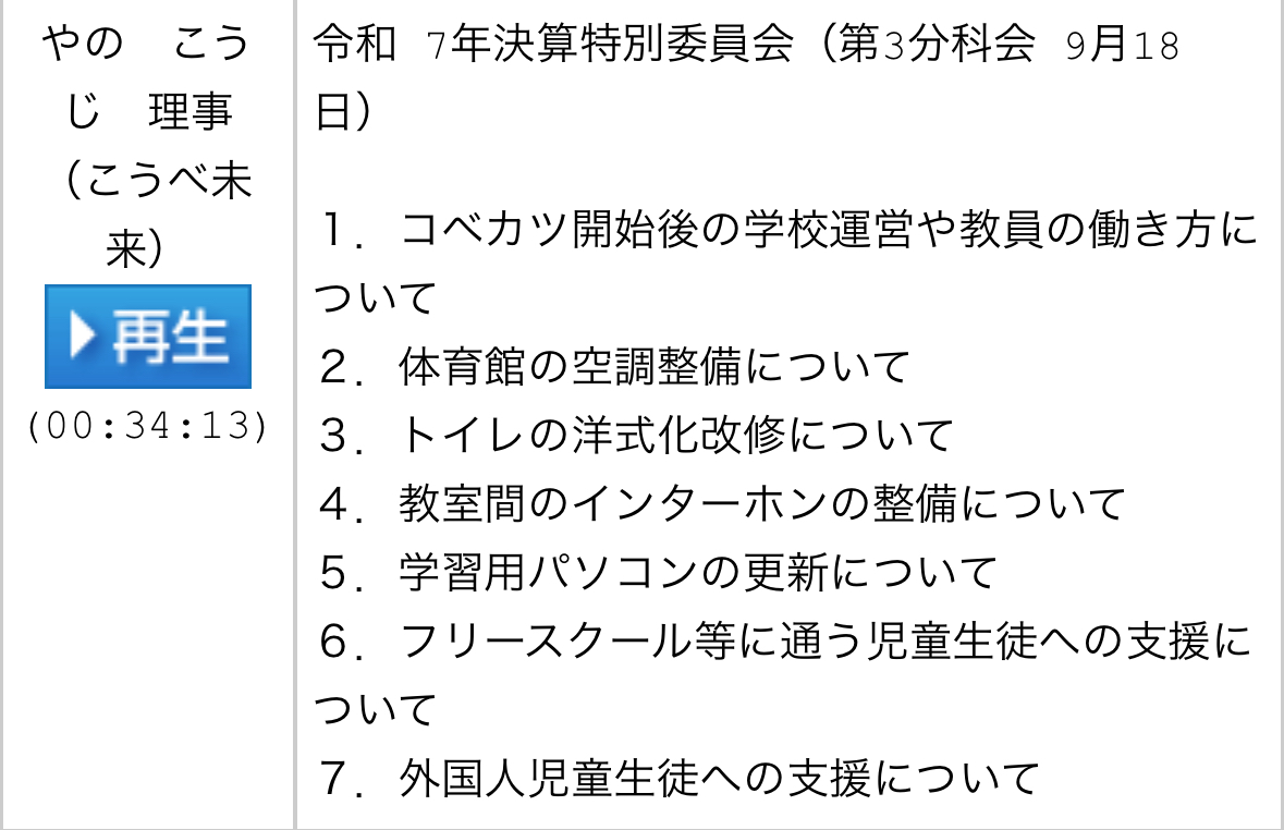 先日の9月18日に、私が所属するこうべ未来市会議員団を代表し、神戸市教育委員会事務局に対し決算質疑を行いました。