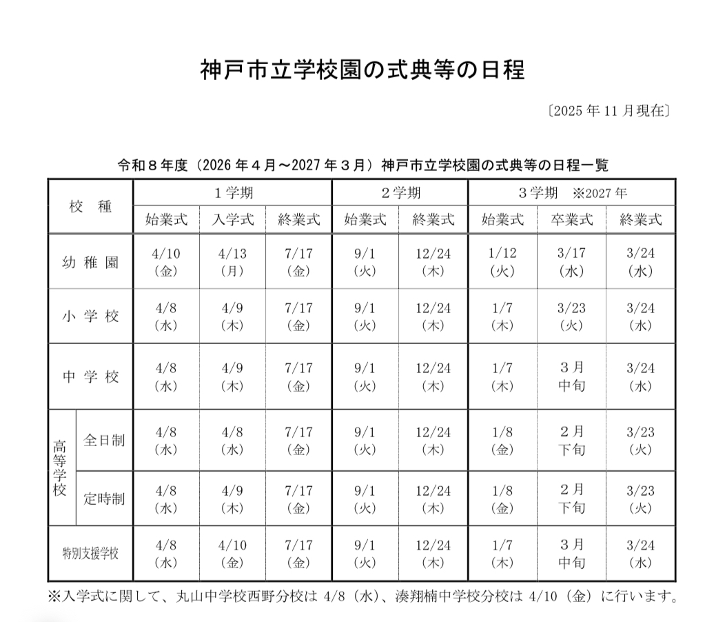 神戸市教育委員会発「令和8年度(2026 年度)神戸市立学校園の式典等の日程について」の最新情報を、共有させていただきます。